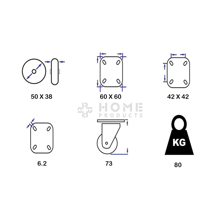 Swivel castor, diameter 50 mm, non-marking rubber tire, load capacity up to 80 kg